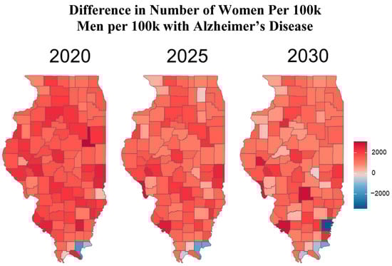 The heat maps above illustrate the difference in Alzheimer’s disease (AD) rates between women and men in each county. This is calculated by subtracting the number of men with Alzheimer’s per 100,000 males from the number of women with Alzheimer’s per 100,000 women. Counties shaded in red indicate a higher proportion of women diagnosed with AD, while those shaded in blue indicate a higher proportion of men diagnosed.