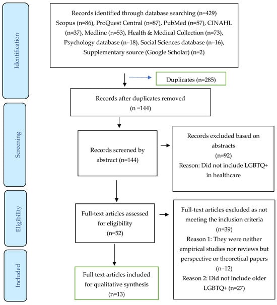 Searching for evidence as our search strategy, we initially found 429 resources (Figure 1). After duplicates were removed, a total of 144 were identified and screened against our inclusion and exclusion criteria. Reviewing the abstracts at this stage, we excluded 92 resources because they were not including people identifying with the LGBTQ+ community. The remaining 52 resources were fully reviewed, and we decided to exclude 12 resources because they were neither empirical studies nor reviews, and 27 because they explicitly studied people younger ages. Therefore, 13 articles were included in this scoping review study. These 13 articles are summarized in Table 3, and critically appraised in Table 4, Table 5 and Table 6.