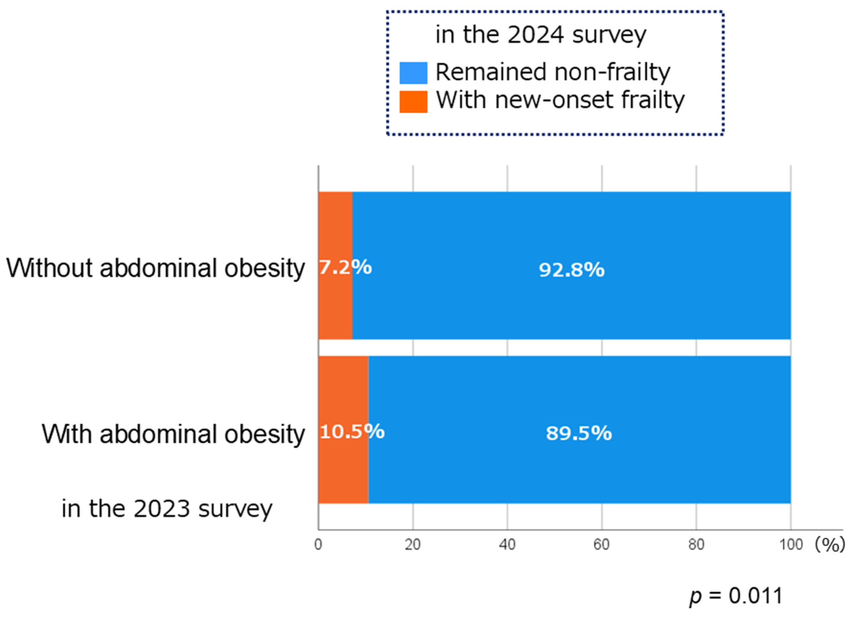 Yokoyama, H. Impact of Abdominal Obesity on Frailty Development: A Web-Based Survey Using a Smartphone Health App. Geriatrics 2025, 10, 147. https://doi.org/10.3390/geriatrics10060147