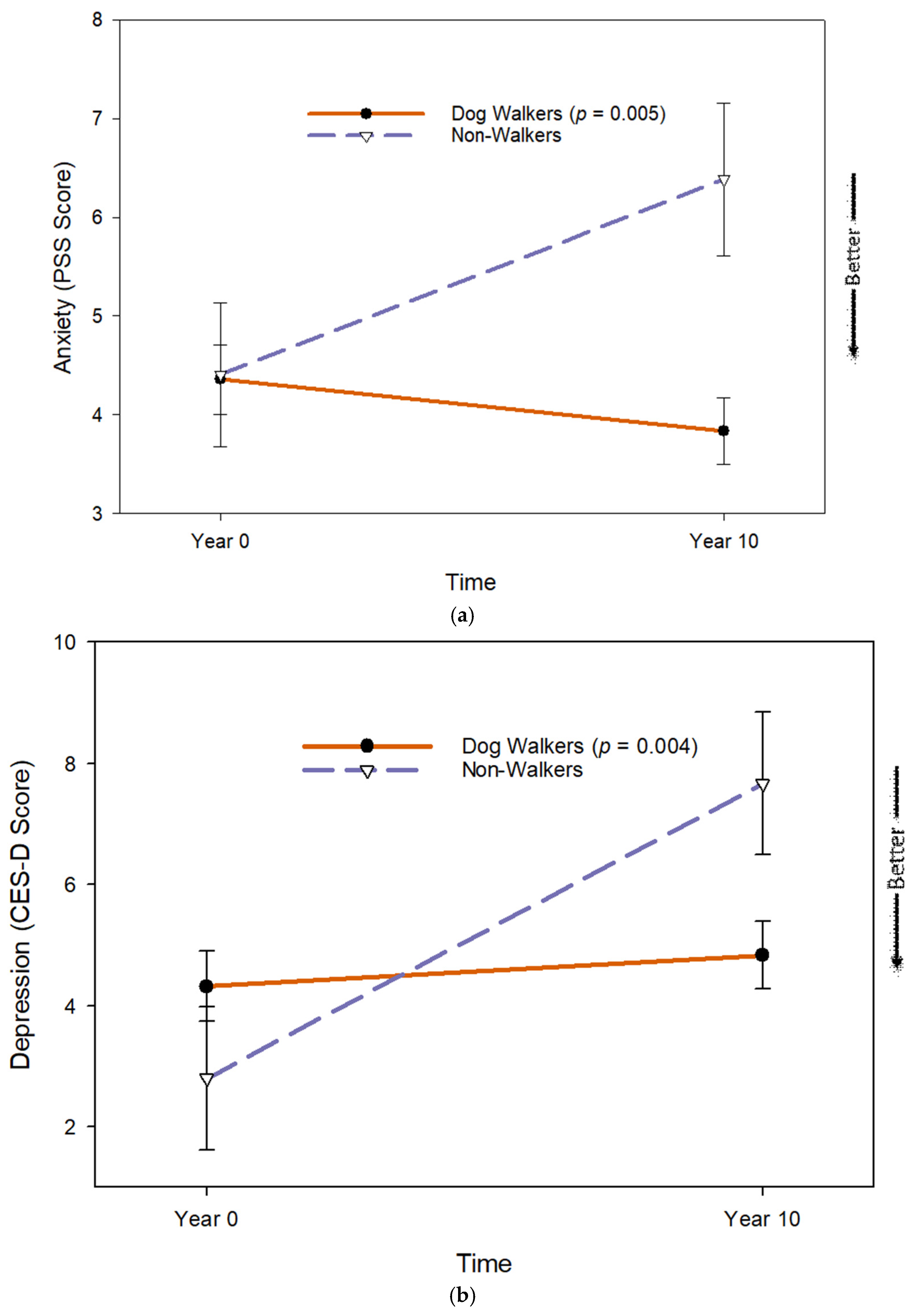 3.4. Dog Walking and Changes in Dog Owners’ Psychological Health with Aging