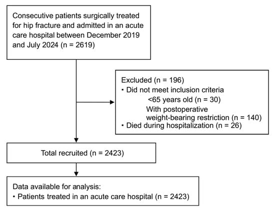 This study was a retrospective analysis of prospectively collected data from the Nagano Hip Fracture Database, a multicenter registry in Japan that gathers information on patient characteristics and rehabilitation outcomes [7]. For this study, we included consecutive patients from 17 acute care hospitals between 1 December 2019 and 31 December 2024. Data were collected using a secure cloud-based electronic data-capture system.