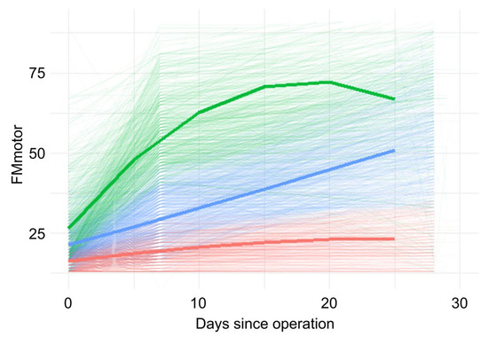 Individual FIM-motor trajectories during the first 30 days after surgery, with estimated class trajectories overlaid.