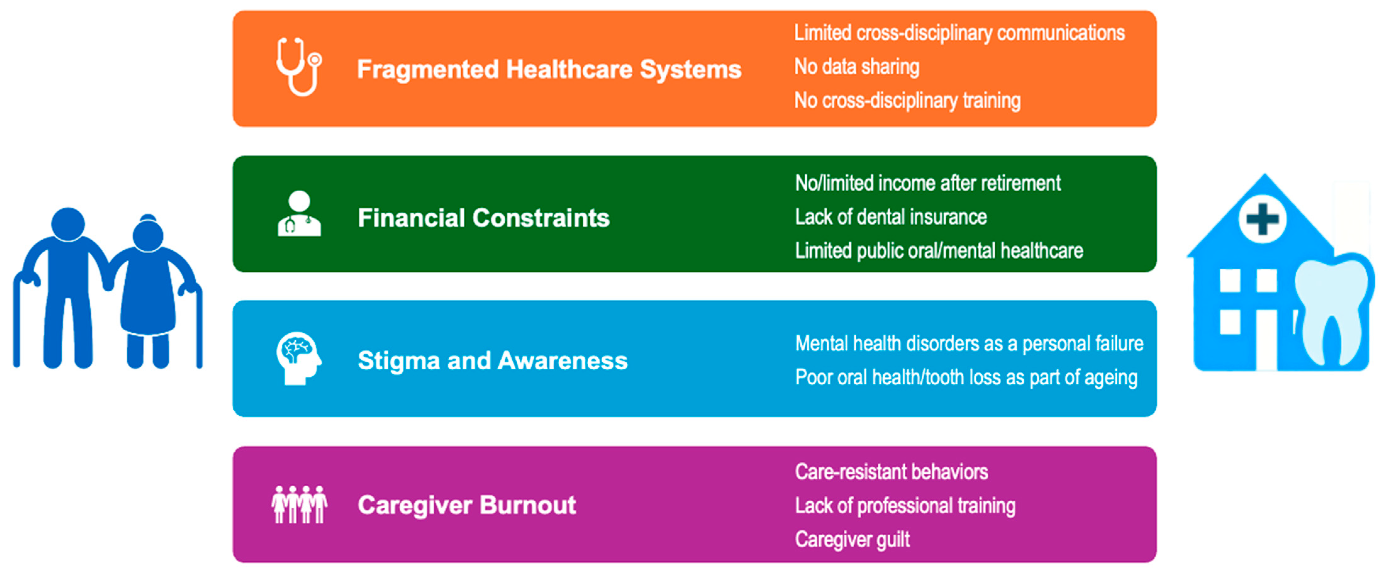 - Murali, A.; Muddappa, S.C.; Rajan, R.R.; Joseph, A.; Ravi, A.B. Barriers to geriatric oral health: A multifaceted public health issue. Cureus 2025, 17, e89604. [Google Scholar] [CrossRef]