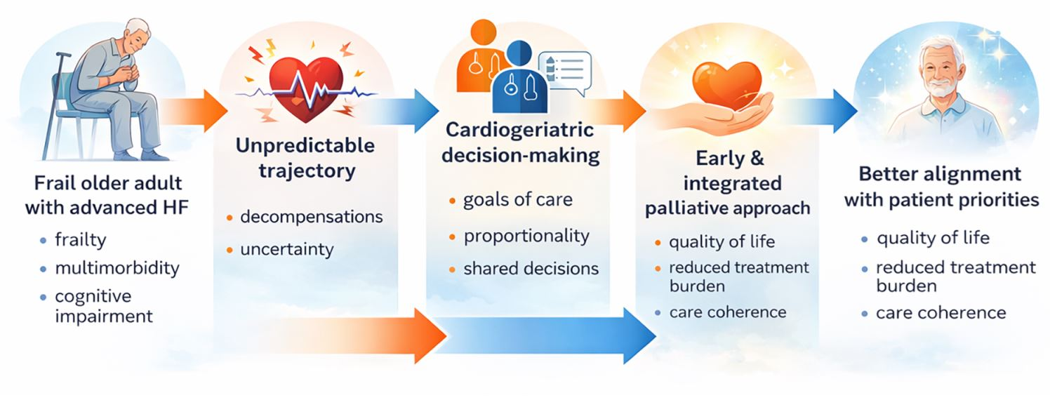 Rather than a late transition from “active treatment” to “palliation”, cardiogeriatric care integrates cardiology, geriatrics, and palliative principles progressively, supported by longitudinal communication and shared decision-making under prognostic uncertainty. This approach offers a pragmatic and ethically grounded response to the growing complexity of cardiovascular care in ageing societies and supports future research on relevance-driven, integrated models of care in frail older adults with HF.