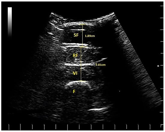 Images were measured later off-line by IH, using a Matlab algorithm (written by MW). The thickness of two tissue layers was measured: (1) the superficial non-contractile layer comprised subcutaneous fat and superficial fascia measured from the skin to the inferior border of the superficial fascial layer; (2) the contractile layer consisted of RF and VI muscles, including the deep fascia between them, measured from the inside edge of the superior border of RF to the inside edge of the inferior border of VI (Figure 2). These two measurements were a simplified version of the measurement protocol used by [], which involved making separate measurements of subcutaneous fat, superficial, and deep fascia and muscle thickness; hence, scans from the earlier study were re-analysed using the modified protocol. Each image was measured twice, and the mean values were used in the analysis.