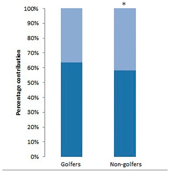 Percentage contribution of muscle thickness plus deep fascia (dark blue) and subcutaneous fat plus superficial fascia (light blue) in golfers and non-golfers. * Difference between groups was statistically significant (p < 0.05).