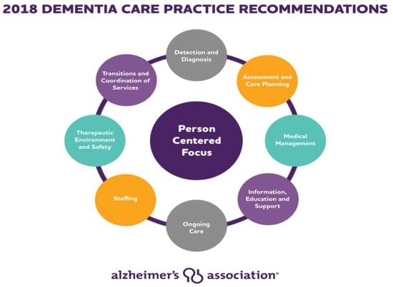 - Fazio, S.; Pace, D.; Maslow, K.; Zimmerman, S.; Kallmyer, B. Alzheimer’s association dementia care practice recommendations. Gerontologist 2018, 58, S1–S9. [Google Scholar] [CrossRef] [PubMed]