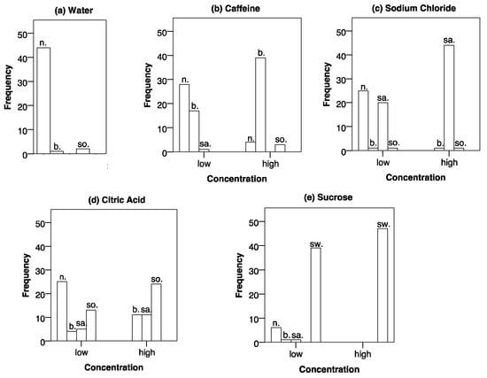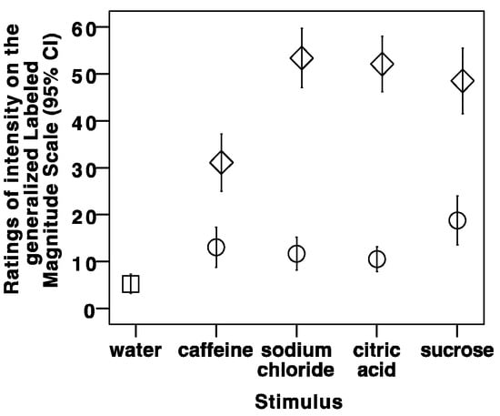 - Hyde, R.J.; Feller, R.P. Age and sex effects on taste of sucrose, NaCl, citric acid and caffeine. Neurobiol. Aging 1981, 2, 315–318. [Google Scholar] [CrossRef]