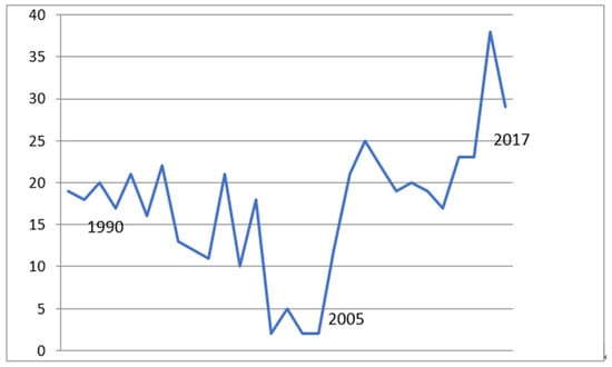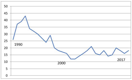 Figure 1. Discharge to long-term care (%). Mean % discharge to LTC (1987–2005) 13.5% (SD 3.6), (2006–2017) 22.3% (SD 4.1), F = 11.76, p < 0.01.