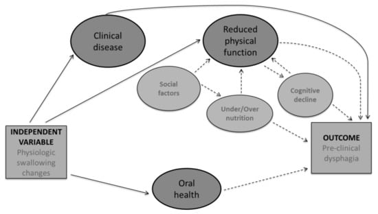 Proposed conceptual framework for the development of pre-clinical dysphagia in the CDOA. Proposed theoretical model for the development of pre-clinical dysphagia in CDOA. Solid lines represent known causes while dashed lines represent reported associations.