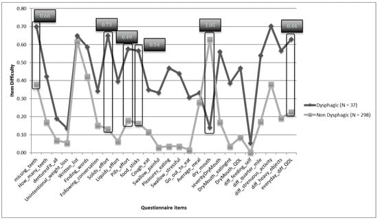Item discrimination graph depicting the difference in perception of item difficulty between participants with and without dysphagia. Items that provided the most meaningful difference are circled, with effect size (Hedge’s g) identified.