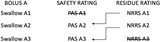 Schematic illustrating a hypothetical three swallow sequence of a single bolus (Bolus A), where the safety ratings from current swallows are analyzed along with residue ratings from previous swallows. PAS: Penetration–Aspiration Scale; NRRS: Normalized Residue Ratio Scale. Schematic is adapted with permission from: Molfenter SM, Steele CM. The Relationship Between Residue and Aspiration on the Subsequent Swallow: An Application of the Normalized Residue Ratio Scale. Dysphagia 2013, 28, 494–500.