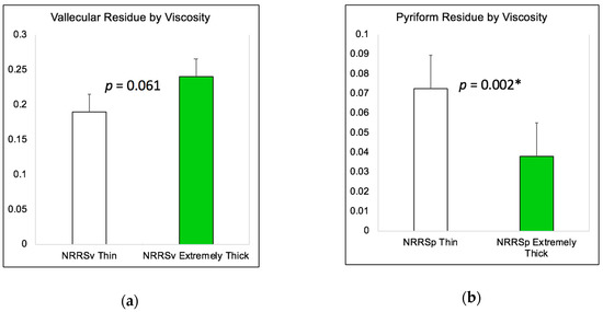 (a) Bar graph depicting in differences in vallecular residue (NRRSv) by bolus viscosity; (b) Bar graph depicting in differences in pyriform sinus residue (NRRSp) by bolus viscosity. * p ≤ 0.05.
