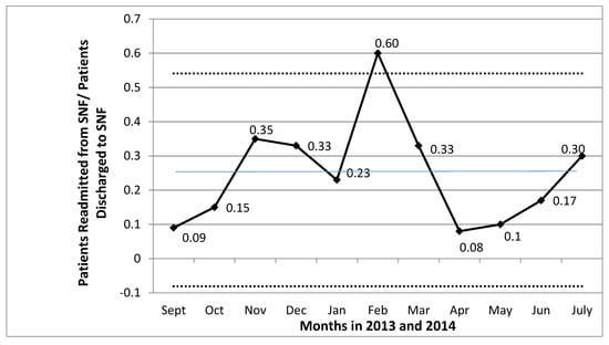 All continuous and categorical data were analyzed using descriptive statistics. Thirty-day unplanned readmission data were analyzed using a U-chart. A U-chart is a type of statistical process control chart, which plots count data with variable sample size versus time in months [40]. Thirty-day unplanned readmission rates for each month were calculated by dividing the number of unplanned readmissions by the monthly discharges to SNF.