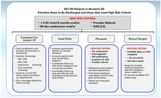 Optimal geriatric care frequently requires a Comprehensive Geriatric Assessment (CGA) to address the medical, psychosocial, and functional complexities of this vulnerable patient population []. While CGAs can be time consuming, they are a critically important aspect of a coordinated care plan that aims to maximize overall health and improve patient outcomes. Assessments of older adults for geriatric specific syndromes were integrated into the clinical work flow of ED nurses at the point of triage and also during the primary nursing assessment. Enhanced electronic health record (EHR) support with discipline specific documentation templates for TCN, SW, RX, and PT helped capture these comprehensive assessments related to geriatric syndromes, cognitive and functional assessments, psycho social needs, and medication management. Patients over the age of 65 were screened with the Identification for Seniors at Risk (ISAR) score [,], Timed Get up and Go Fall risk assessment [], and the brief Confusion Assessment Method (bCAM) for delirium []. Patients with ISAR score >2, fall risk, multiple prior ED visits, hospital admissions were considered to have met high-risk criteria.