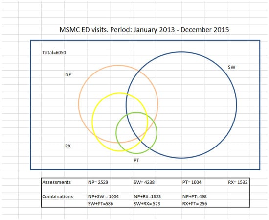 Many individuals had multiple consultations during the same ED visit. The most common combinations of shared assessment included NP and pharmacist or NP and SW, as shown in Figure 2. Team members could decide to see patients together, or individually, and then make final recommendations once information was gathered by the various disciplines. Furthermore, clinical decision-making and care planning were enhanced by the multiple sources of evaluation. Figure 2 highlights the overlap in collaborative assessments per discipline.