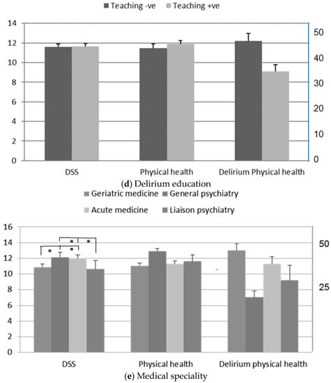 Analysis of delirium stigma, physical health, and delirium physical health measurements in respect to delirium in respect to (a) gender; (b) professional role; (c) delirium experience; (d) education; and (e) medical speciality. Physical health was determined according to EuroQol five dimensions questionnaire (EQ-5D-5L), and the delirium physical health was scored on the EQ-VAS. The scale on the left relates to the delirium stigma scale (DSS) and EQ-5D-5L measures (scores), whereas the one on the right is related to the EQ-VAS scores. Professionals working in geriatric medicine and liaison psychiatry had significantly lower DSS scores compared to professionals working in acute medicine and general psychiatry (e). * p < 0.05.