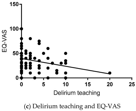The correlation analysis highlighted the close relationship between the DSS and physical health (r = 0.237, p = 0.009; Figure 2a), whereas the length of professional experience was associated with lower physical scores (r = −0.206, p = 0.024; Figure 2b). Not surprisingly, the length of professional experience was associated with participants’ ages (r = 0.677, p = 0.0001; data not shown). In contrast, the extent of delirium teaching did not influence either the DSS (r = 0.073, p = 0.395) or the physical health (r = 0.057, p = 0.539) scores, and was not linked to the length of professional experience (r = 0.043, p = 0.691) or age of participants (r = 0.014, p = 0.874; data not shown). However, it was associated with the objective measure of the physical health in delirium subjects, as measured with the EQ-VAS scale (r = −0.255; p = 0.004; Figure 1c). Thus, participants who had formal delirium training were able to correctly identify that patients with delirium had poor physical health.