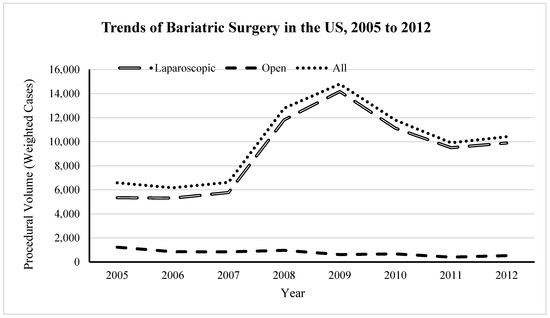 - Nguyen, N.T.; Root, J.; Zainabadi, K.; Sabio, A.; Chalifoux, S.; Stevens, C.M.; Mavandadi, S.; Longoria, M.; Wilson, S.E. Accelerated Growth of Bariatric Surgery with the Introduction of Minimally Invasive Surgery. Arch. Surg. 2005, 140, 1198–1202. [Google Scholar] [CrossRef]