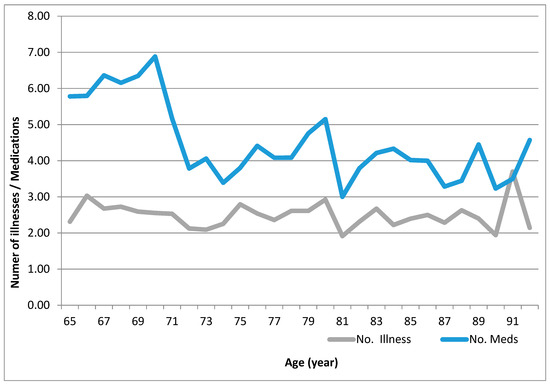 Comorbidity, a concept that describes the complication of other disease conditions on geriatric patient, might have another primary condition of interest. The comorbidity–polypharmacy score consists of the sum of all known comorbid conditions and all associated medications. This score is helpful in deciding how to estimate the risk of death and how aggressively to treat a condition [24,25,26]. In this study, we differentiate to find out the correlation between the number of diseases and number of illnesses, and it was obvious and significant difference that those aged 65–70 had a higher number of medications compared with older patients; this difference was statistically significant with p < 0.01.
