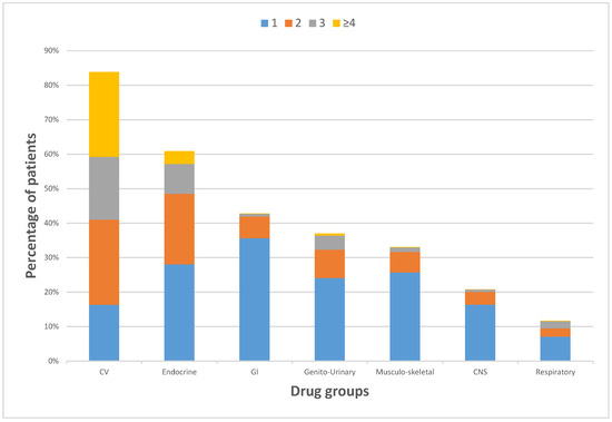 Table 1 shows that elderly patients on cardiovascular drugs (including calcium channel blockers, angiotensin-converting-enzyme inhibitor, angiotensin II receptor blockers, vasodilators, and other cardiovasculars; also including antilipidemics, antithromobotics, and antiarrythmics) had the greatest percentage with 83.9%, where some of these patients received no other drugs. In the mean time, elderly patients on cardiovascular (CV) drugs showed the most patients with polypharmacy. Elderly patients on endocrine medications (including insulin, biguanides, sulfonylureas, and new classes of antidiabetics; as well as antithyroids) were prescribed next to cardiovascular medications with almost 61%, where almost 10% of these patients had polypharmacy. Patients with gastrointestinal (GI) drugs (42.8%), genito-urinary drugs (37%), musculoskeletal drugs (33%), Central Nervous System (CNS) drugs (20.8%), and respiratory drugs (11.6%), where all patients with these comorbidity diseases had less polypharmacy.