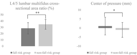 This study included 99 participants (63 men, 36 women; fall risk group, 30; non-fall risk group, 69) with a mean age of 75.8 (range, 65–85) years who were admitted to the hospital. Each participant was diagnosed with lumbar spinal canal stenosis. The power analysis for the sample size revealed that the optimal sample size for this study was 62 participants (fall risk group = 19 and non-fall risk group = 43). In all, 99 participants (fall risk group = 30 and non-fall risk group = 69) participated in this study. The effect size for the L4/5 LMCSAR was d = 0.8. The effect sizes for the other variables were as follows: COP, d = 0.5; SVA, d = 0.2; age, d = 0.3; height, d = 0.3; weight, d = 0.1; BMI, d = 0.4; sex, Cramer’s V = 0.1; fall score, d = 3.2; VAS, d = 0.3; and GDS, d = 0.3. Table 1 and Table 2 show the baseline clinical characteristics of the study participants and a comparison of the two groups. The fall risk group showed a lower L4/5 LMCSAR (p = 0.002) and an increased COP excursion (p = 0.034) compared to the non-fall risk group (Figure 1). The age, height, weight, body mass index, sex, VAS score, GDS-15 score, and SVA values were not significantly different.