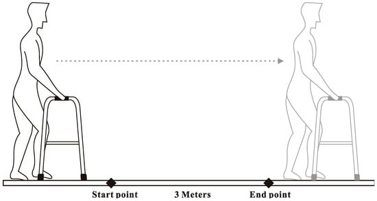 A walking motion with a walker is a repeated motion, just as walking normally is []. The process of using a walker is as follows: the user first holds onto the walker with both hands and moves the walker half a step forward; the user then moves the injured leg forward, maintaining his/her center of gravity above the center of the walker; and, finally, the user moves the healthy leg forward. This process is repeated when walking []. The Berg Balance Scale (BBS) is the most commonly used tool for evaluating the balance of patients or older adults []. BBS scores of 0–20, 21–40, and 41–56 indicate high, medium, and low fall risks, respectively []. Many studies have proven that high-risk groups are more likely to fall and become hospitalized [], and that walking speed is an extremely important factor in determining balance [].