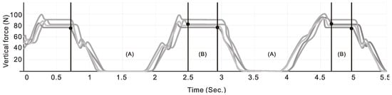 The study data mainly comprised the GC of the subjects when using a walker to walk. The stance and swing phases when using the walker were defined as follows. The stance phase is based on the theory of Peat et al. [] and Aikaterini et al. [], and was defined as from the moment one leg of the walker is lifted from the ground until the walker is stably placed on the ground. The swing phase is the phase when the body is moving. According to Mohammed et al. [] and Aikaterini et al. [], the swing phase starts after the point when the walker is placed stably on the ground to when one leg of the walker is lifted from the ground. One stance phase and one swing phase form one GC. This study used the time required for two GCs to evaluate the pattern and magnitude of forces.