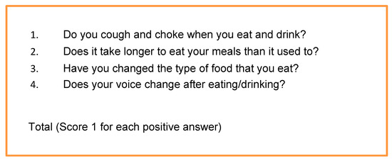 The use of a simple questionnaire-based swallow screen is not new and two other studies have reported similar results with similar screening tools. Uhm et al. (2019) reported a 12-point questionnaire that correlated with a modified water swallow test (r = −0.468, p < 0.0001). The study cohort was however predominantly neurological in nature (57% stroke), whereas the 4QT cohort were predominantly frail [30]. Schrock et al. (2011) conducted a similar study, based in the emergency department. Their swallow screen consisted of five questions which were aimed at the assessor not the patient. Furthermore, their cohort was predominantly stroke patients [31]. Their conclusion was that the screen was probably useful. A subsequent publication indicated that the incidence of pneumonia had been reduced when the screen was introduced [24]. The advantage of the 4QT is that it is easy to use and can be undertaken by any member of staff without prior training. There is the added advantage that in clinically busy settings and out of hours, there is no need to look for a teaspoon or to establish the time taken to swallow a fixed volume of water.