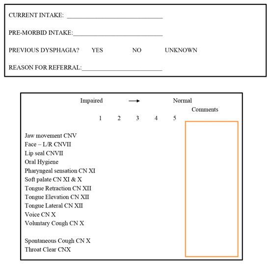 A literature search was conducted using PubMed and Google Scholar and to identify papers that reported the development and validation of simple bedside assessments/swallow screens (e.g., Bed Side Assessment, EAT-10) [19,20,21,22,23,24] (Table 1). Search terms included “frailty”, “Swallow” “screen” “dysphagia” “old age” (The search of the literature was not undertaken in the manner of a formal systematic review; hence the PRISMA guidelines were not followed). The items contained within the swallow tool were listed (Table 2).