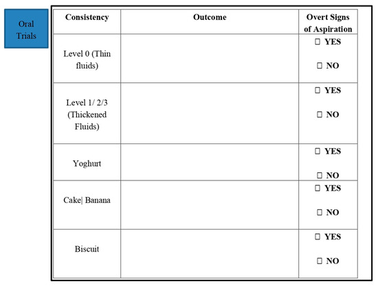 A score of zero was taken to indicate that the participant had no swallowing problems (a similar approach was taken by Schrock et al. [24]), whereas a positive score on any of the elements was taken to indicate that there may be a problem with swallowing (but not the presence of aspiration).