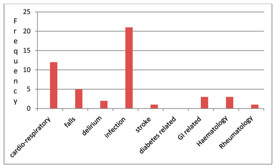The median age of those taking part was 83 years (range 75–102). A total of 58% (28) were male. The median clinical frailty score was 4 (range 1–7); 30 (62.5%) had a clinical frailty score of 5 or less. The inpatient diagnosis was diverse but representative of an acute frailty ward (Figure 2).