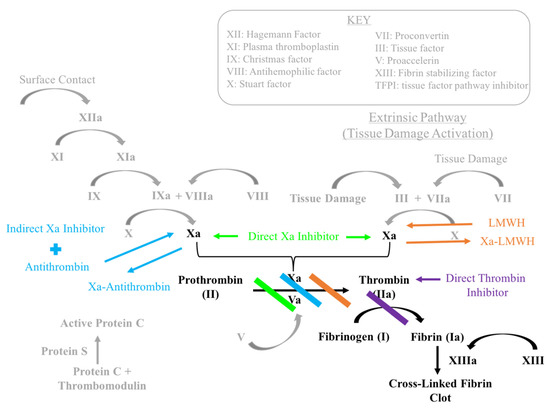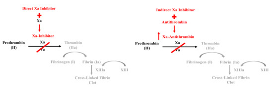 - Samama, M.M. The mechanism of action of rivaroxaban--an oral, direct Factor Xa inhibitor—Compared with other anticoagulants. Thromb. Res. 2011, 127, 497–504. [Google Scholar] [CrossRef]