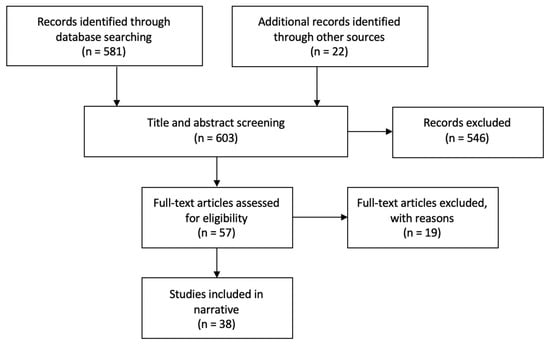 The database search yielded 581 results. A further 22 records were identified through other sources. Title and abstract screening were conducted by two independent researchers. Any discrepancies of the inclusion decision were resolved through discussion. Following the screening process, 57 articles remained. All were read in full by the primary author. Following full text reading, 38 were deemed relevant for this review. The main findings of these studies can be found in Table 1. This selection process is illustrated below in Figure 1.