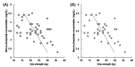 Correlation analysis between serum phosphorus concentration and hand grip strength. The vertical axis indicates the serum phosphorus concentration (mg/dL). The horizontal axis indicates grip strength (kg). Any correlations seen were validated using Pearson’s correlation coefficient. An inverse correlation is observed between the serum phosphorus concentration and hand grip strength in (A) total patients (r = −0.501, 95% confidence interval: −0.700, −0.228, p < 0.001), and (B) patients with eGFR ≥ 30 mL/min/1.73 m2; higher hand grip strength, n = 18 and lower hand grip strength, n = 18 (r = −0.501, 95% confidence interval: −0.712, −0.207, p = 0.002). eGFR, estimated glomerular filtration rate.