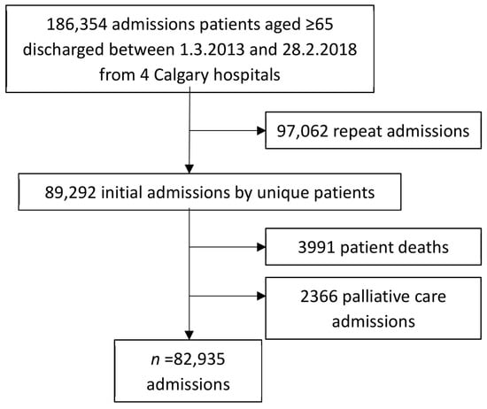 From 1 March 2013 to 28 February 2018 the first admission of all patients ≥ 65 years admitted to the four acute-care Calgary hospitals (Foothills Medical Centre, Rockyview General Hospital, Peter Lougheed Centre, and South Health Campus) constituted the sample (n = 82,935) (Figure 1). We included elective surgeries, as these patients could also have PIMs/PPOs. These patients had 97,062 readmissions over the five-year period and are the subject of another article. The current study population excludes those admitted for palliative care (whose medications were likely to differ substantially from their usual medications) or who died during this first admission (and thus by definition had no medications subsequent to discharge).
