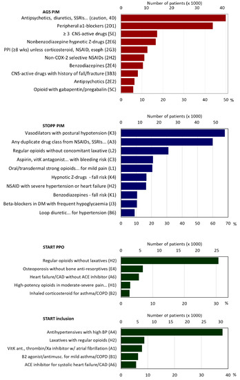 - Wauters, M.; Elseviers, M.; Vaes, B.; Degryse, J.; Dalleur, O.; Vander Stichele, R.; Christiaens, T.; Azermai, M. Too many, too few, or too unsafe? Impact of inappropriate prescribing on mortality, and hospitalization in a cohort of community-dwelling oldest old. Br. J. Clin. Pharmacol. 2016, 82, 1382–1392. [Google Scholar] [CrossRef] [PubMed]