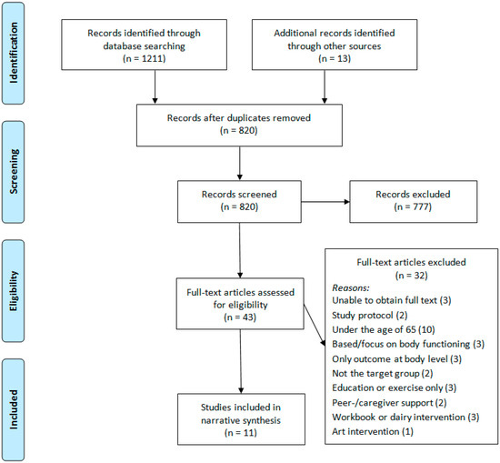 The PRISMA flow diagram [21] of the review process and selection of studies is shown in Figure 1. Once duplicates were removed, 820 references were screened for eligibility. Full text was obtained for 43 studies, 32 of which were subsequently excluded. Reasons for exclusion were not being able to obtain full text on three occasions [24,25,26], two studies turning out to be protocols [27,28], ten studies having a population with a mean age under 65 years [29,30,31,32,33,34,35,36,37,38], three study interventions being based on body functions [39,40,41], three studies only including outcome measures at body level [42,43,44], two studies not including the target population or including other chronic diseases [45,46], three studies focusing on education or exercise only [47,48,49], two studies providing peer or caregiver support [50,51], three studies involving a workbook or diary as the only content in the intervention [52,53,54], and one study being based on art [55]. This resulted in eleven studies eligible for inclusion in this review [56,57,58,59,60,61,62,63,64,65,66]. The reference lists of these eleven studies were hand-searched for additional studies that met the inclusion criteria. No additional studies were identified. Data from these eleven articles were extracted for synthesis.