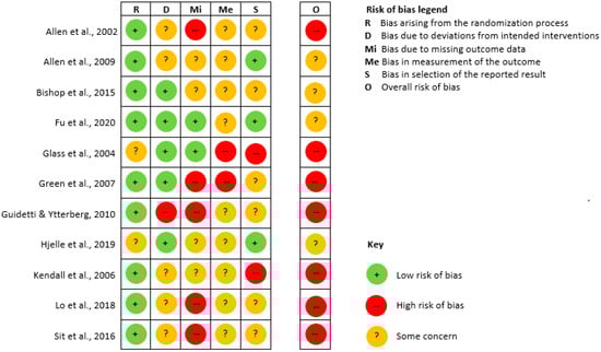 An estimation of possible risk of bias is presented in Figure 2. None of the eleven studies were judged to have low risk of bias across all domains. Seven of the studies had a high risk of bias in at least one domain, which is why the overall risk of bias was judged also to be high [56,60,61,62,64,65,66]. The overall risk of bias in the remaining four studies raised some concern [57,58,59,63]. The major methodological weakness of the included studies was bias in measurement of the outcome as none of the outcome assessors were blinded to group assignment. Three studies also seemed to use investor-generated non-standardized measurements which were unlikely to be sensitive to plausible intervention effects, and/or were likely to have poor validity [57,60,61]. Furthermore, missing outcome data due to loss of follow-up (>20%) and missing/insufficient methods correcting for missing outcome data, was a methodological weakness. None or insufficient details limited the ability to determine whether data in the included studies were analyzed in accordance with a pre-specified plan in nine of the studies. An overview of the answers to signaling questions, together with free-text justification of the answers, is available in Table S4.