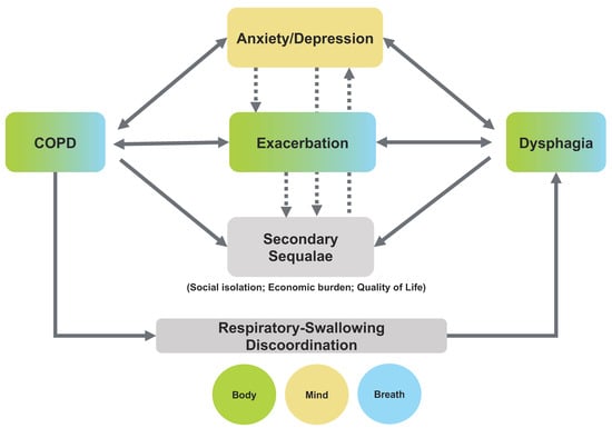 This review supports the existence of an intricate relationship between the physiological impairments and primary psycho-emotional consequences of COPD and dysphagia, as well as their secondary sequalae, that maps onto the mind-body-breath framework, as proposed in Figure 2. One entry point into the framework is COPD’s contribution to dysphagia via its influence on respiratory-swallowing coordination (bottom arrow in Figure 2). Both COPD and dysphagia are physiologically-based conditions, intertwining the body (green boxes) with the breath (blue boxes), either as a symptom (i.e., shortness of breath) or protection (i.e., swallowing respiratory cessation). Yet the comorbidities of COPD and dysphagia are widespread, influencing both the mind (tan boxes) as in anxiety/depression and the body/breath as in exacerbations. These comorbidities, in turn, loop back to influence the physiology of the diseases, particularly as the diseases progress. Both chronic conditions also share similar secondary sequalae related to more global effects on life. In addition to the direct impact of the diseases’ physiology on these secondary sequalae, the psycho-emotional consequences of anxiety/depression, and even the consequences of multiple exacerbations, subsequently affect the secondary sequalae also. These secondary sequalae may then magnify the psycho-emotional impacts of the disease, further contributing to the negative influence of COPD and dysphagia on individual well-being. This complex network of the relationships between disease and primary physio-psycho-emotional sequalae, as well as the intricate feedback loop of their secondary sequalae, requires greater research attention. As none of the boxes represented in Figure 2 occur in isolation, it also calls for a more comprehensive and systematic clinical lens to be used when working with individuals with COPD and/or dysphagia, particularly as the prevalence of these diseases is predicted to rise [,].