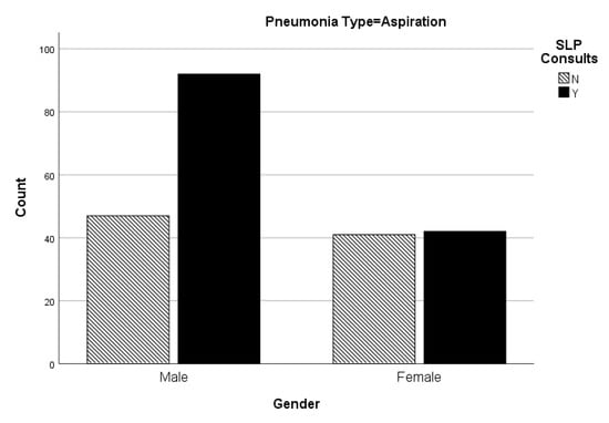 When the pneumonia categories are analyzed further (see Table 4), there is a statistical significance for the presence/absence of SLP dysphagia consults in aspiration pneumonia as related to the gender categories (p = 0.022). Male patients admitted to the hospital with aspiration pneumonia were more likely to receive an SLP dysphagia consult (see Figure 1). The likelihood that this does not occur by chance is significant (rϕ = 0.154, p = 0.022). However, there is no statistical significance (p > 0.05) in SLP dysphagia consults for the other categories of pneumonia (i.e., organism not specified, health care-acquired, and community-acquired) related to the gender categories. There was a very weak correlation for an SLP consult for gender and organism not specified pneumonia, though not statistically significant (rϕ = 0.013, p = 0.694). There was a moderate correlation but no statistical significance for an SLP consult for gender and health care-acquired pneumonia (rϕ = −0.11, p = 0.25). There was a weak correlation for an SLP consult for gender and community-acquired pneumonia, though not statistically significant (rϕ = 0.06, p = 0.344).