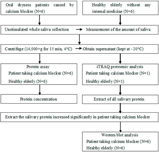 Oral dryness patients caused by calcium blocker (6 women, mean age: 70.3 ± 10.0 years, taking amlodipine besilate 2.5 mg over 5 years) who attended the Dry Mouth Clinic in The Nippon Dental University Niigata Hospital and healthy elderly without any systemic disease, any internal medicine, and any health problems (2 men, 4 women, mean age: 69.0 ± 5.3 years) who attended The Nippon Dental University Niigata Hospital for the periodic health examination were investigated. The study was conducted in accordance with the Declaration of Helsinki, and the protocol was approved by the Ethics Committee of The Nippon Dental University School of Life Dentistry at Niigata (ECNG-H-155). All subjects gave their informed consent for inclusion before participating in the study. Protocol of this study is shown in Figure 1.