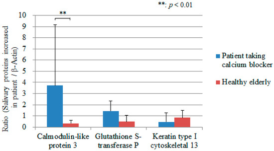 The expression of calmodulin-like protein 3, glutathione S-transferase P, and keratin type I cytoskeletal 13 divided by the value of β-Actin on the patient taking calcium blocker and healthy elderly. Measurements are expressed as mean value + SD. **: p < 0.01.