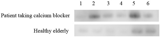 The detected protein bands of the calmodulin-like protein 3 on 6 patients taking calcium blockers and six healthy elderly.
