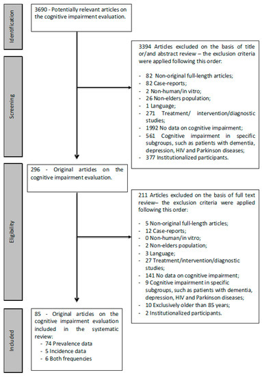 The exclusion criteria were as follows: non-original full-length articles (e.g., a systematic review, guidelines, meta-analysis, review, comment, editorial, note, meeting abstract); case-reports; non-human/in vitro; non-elderly population (studies conducted in populations described as consisting exclusively or partially of children, adolescents or adults); language (papers not written in English, Spanish, French or Portuguese were excluded); treatment/intervention/diagnostic studies; no data on cognitive impairment (studies that did not report prevalence or incidence of cognitive impairment); cognitive impairment in specific subgroups, such as patients with dementia, depression, HIV and Parkinson’s disease; studies including the oldest old only (over 85 years old); institutionalized participants in hospitals, clinics or nursing homes (to obtain data for older people present in the general population and not report on a special population).