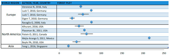 Grouping papers according to inclusion age (50–59 years old, 60–69 year old, and ≥70 years old), the reported prevalence ranges from 6.5% to 34% (median = 12%; 25th percentile = 9.6%; 75th percentile = 17.65%) in the first group [17,19,20,23,24,25,26,41,57,60,61,62,75,81], 5.1% to 37.5% (median = 20.1%; 25th percentile = 14.2%; 75th percentile = 24.7%) in the second group [11,12,13,14,15,16,21,22,28,30,31,32,33,34,35,36,37,38,39,40,42,44,45,46,49,50,51,52,53,54,55,56,59,63,64,65,66,67,68,69,70,71,72,73,74,76,77,78,79,80,82,83,84,85,86,87,88,89] and from 11.6% to 41% (Med = 19%; 25th percentile = 15%; 75th percentile = 29.90%) in the last group [18,27,29,34,43,47,48,58,90].