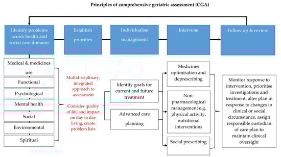 Principles of comprehensive geriatric assessment (CGA). CGA is an evidence-based multidimensional and interdisciplinary assessment of medical, psychological, and functional capabilities aimed at developing an integrated plan for treatment and care. CGA is associated with favourable clinical and health care outcomes. The core principles of CGA include comprehensive history taking and multidisciplinary led assessment, culminating in goals for current and future management. They encompass the 5 tenets of age-friendly care: 1. what matters most to the patient, 2. multi-complexity management, 3. medication management, 4. mentation, and 5. mobility. These principles can be applied across any health and social care setting and have been shown to be highly effective in the management of older people living with frailty and multi-morbidity. The process is iterative and the key to its success is timely review and coordination so that the care plan generated from a CGA remains responsive to the patient’s needs [24,46,66,69,70].