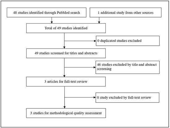 The PubMed search identified 48 studies; one additional study was found by reviewing reference lists of relevant articles. Forty-five studies were excluded based on the title and abstract screening, and no study was excluded based on the full-text review. This left three studies [29,30,31] that fulfilled the inclusion criteria for this review. The flow chart of the literature search is shown in Figure 1.