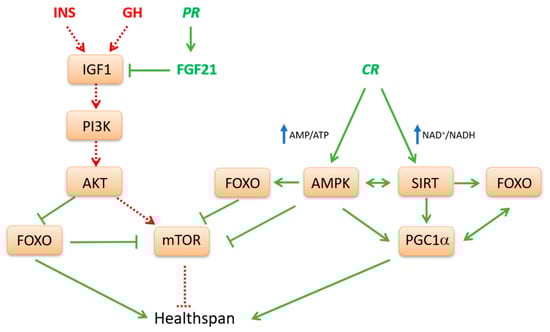 Interplay between nutrient-sensing pathways potentially affecting health span. A complex crosstalk exists between nutrient and energy-sensing pathways in mammals. Caloric restriction (CR), that is a 25–30% reduction of caloric intake without malnutrition, as well as other dietary restriction (DR) interventions such as protein restriction (PR) or low protein/carbohydrate diets represent conditions that downregulate the insulin-like growth factor 1 (IGF1) mediated pathway. A reduced signaling of this pathway leads to a decrease of AKT, which causes the inhibition of mammalian target of rapamycin (mTOR) and activation of forkhead box O transcription factor (FOXO) which, in turn, suppresses mTOR. Reciprocal modulation of mTOR and FOXO induced by CR correlates with reduced global protein synthesis and decreased cell growth and proliferation. In PR conditions, low levels of essential dietary amino acids, particularly of methionine, stimulates the expression of fibroblast growth factor 21 (FGF21), a main inhibitor of IGF1 signaling. Through these mechanisms, DR orchestrates a program of genes involved in protein homeostasis and stress resistance that positively affects health span. Under conditions of CR, increased cellular AMP/ATP and NAD+/NADH ratios cause activation of AMP-activated protein kinase (AMPK) and sirtuins (SIRTs), respectively. AMPK, a critical cellular energy sensor, inhibits mTOR and contributes to stimulate SIRTs, including SIRT1 and SIRT3. In turn SIRTs, through a positive loop, further favor activation of AMPK itself. Both AMPK and SIRTs activate FOXO and peroxisome proliferator-activated receptor gamma coactivator 1α (PGC1α) through phosphorylation and deacetylation, respectively. PGC1α coactivates FOXO thus favoring the expression of key antioxidant enzymes as well as pathways involved in autophagy and mitophagy. Moreover, PGC1α induces the transcription of many important genes involved in mitochondrial biogenesis, complete fatty acid oxidation and stress resistance pathways. Therefore AMPK, SIRTs, FOXO and PGC1α can engage in a positive feedback loop, thus connecting these sensors into a unified response which may improve health span. This simplified model does not account for macronutrient-specific responses or tissue-specific nutrient detection and it does not distinguish between different tissues when summarizing downstream signaling effects.