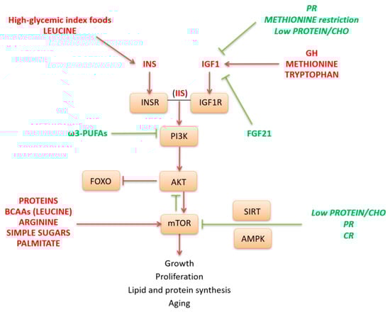 The IIS pathway and its downstream target mTOR are activated in fed condition as well as by specific nutrients such as simple sugars, high glycemic index carbohydrates (CHO), and some AAs. In particular, CHO and leucine are key stimulators of insulin release, while the AAs methionine and tryptophan are key effectors of the GH-IGF1 pathway. Globally, mTOR activation requires a permissive hormonal state for anabolism, as signaled by the IIS pathway. In fact, the IIS, through AKT, leads to the activation of mTOR and inhibition of FOXO (Figure 2). Activated mTOR, in turn, inhibits AKT and can negatively regulate IIS through inhibition of insulin receptor substrate 1 (IRS1). This negative feedback loop between mTOR and insulin signaling has been causally linked to a condition of insulin resistance. The kinase mTOR is a central regulator of cell growth and proliferation in response to growth factors and nutrients. It is involved in anabolic processes such as protein, lipid and nucleotide synthesis and may play a crucial role in aging. mTOR pathway may be directly activated by different nutrients such as animal proteins, specific AAs as leucine and arginine [106,107,108], simple sugars as glucose or fructose [109], as well as by the saturated fatty acid palmitate. Conversely, mTOR is repressed by low protein and calorie diets and by ω-3 polyunsaturated fatty acids (PUFAs), which also act as negative modulator of PI3K-AKT pathway [110] (Figure 2).